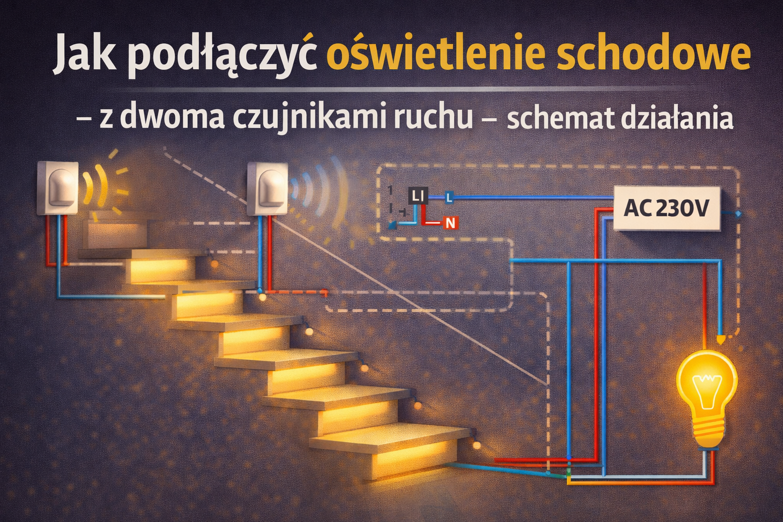 Podłączenie oświetlenia schodowego z dwoma czujnikami ruchu opiera się na jednej kluczowej zasadzie – czujniki muszą być połączone równolegle. Dzięki temu każdy z nich może niezależnie uruchomić światło.