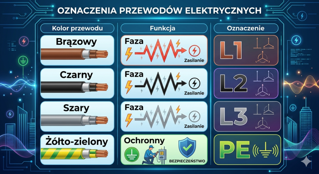 - PE → żółto-zielony (zawsze do zacisku ochronnego)