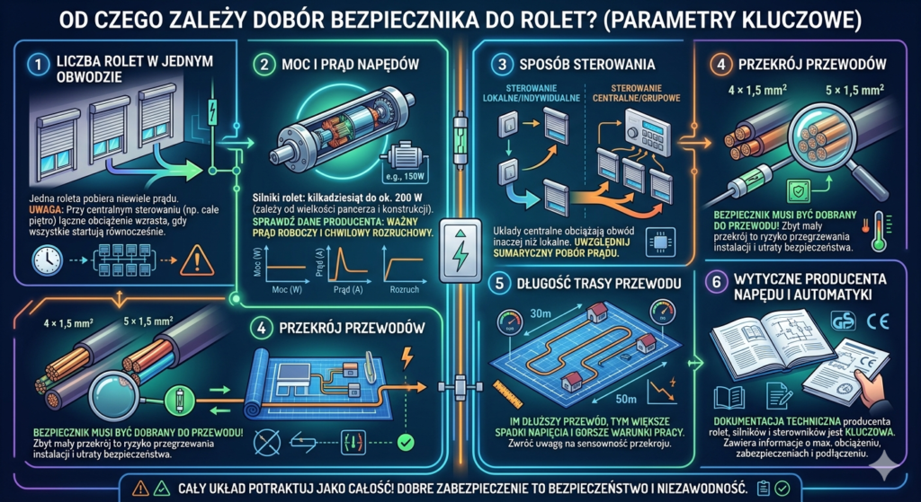 Dobierając bezpiecznik do rolet zewnętrznych, należy uwzględnić kilka kluczowych parametrów. Nie wystarczy spojrzeć wyłącznie na moc jednego silnika. Cały układ trzeba potraktować jako całość.