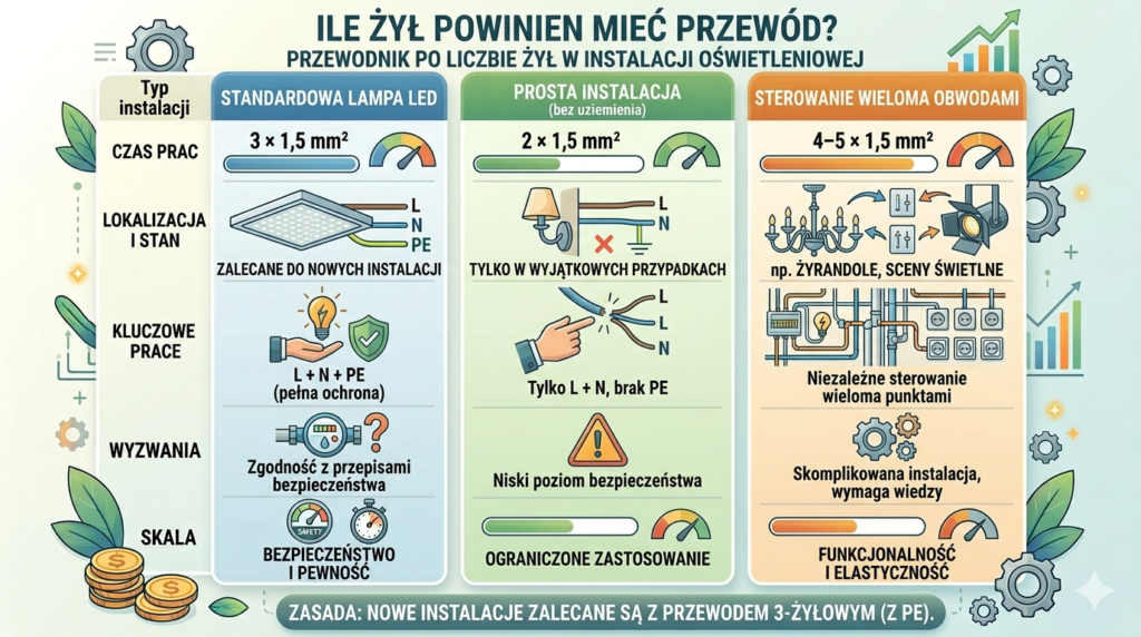 | Standardowa lampa LED | 3 × 1,5 mm² | L + N + PE (zalecane) |