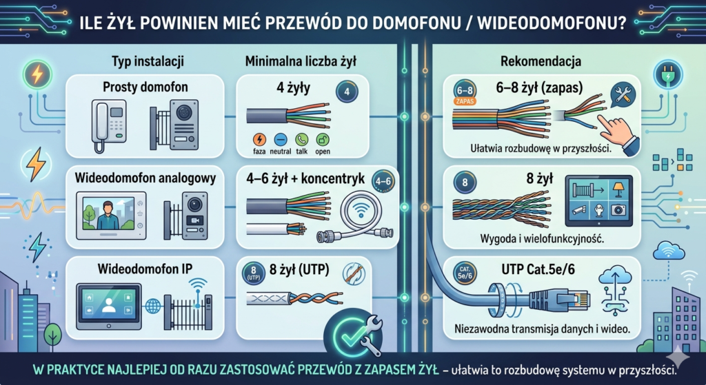W praktyce najlepiej od razu zastosować przewód z zapasem żył – ułatwia to rozbudowę systemu w przyszłości.